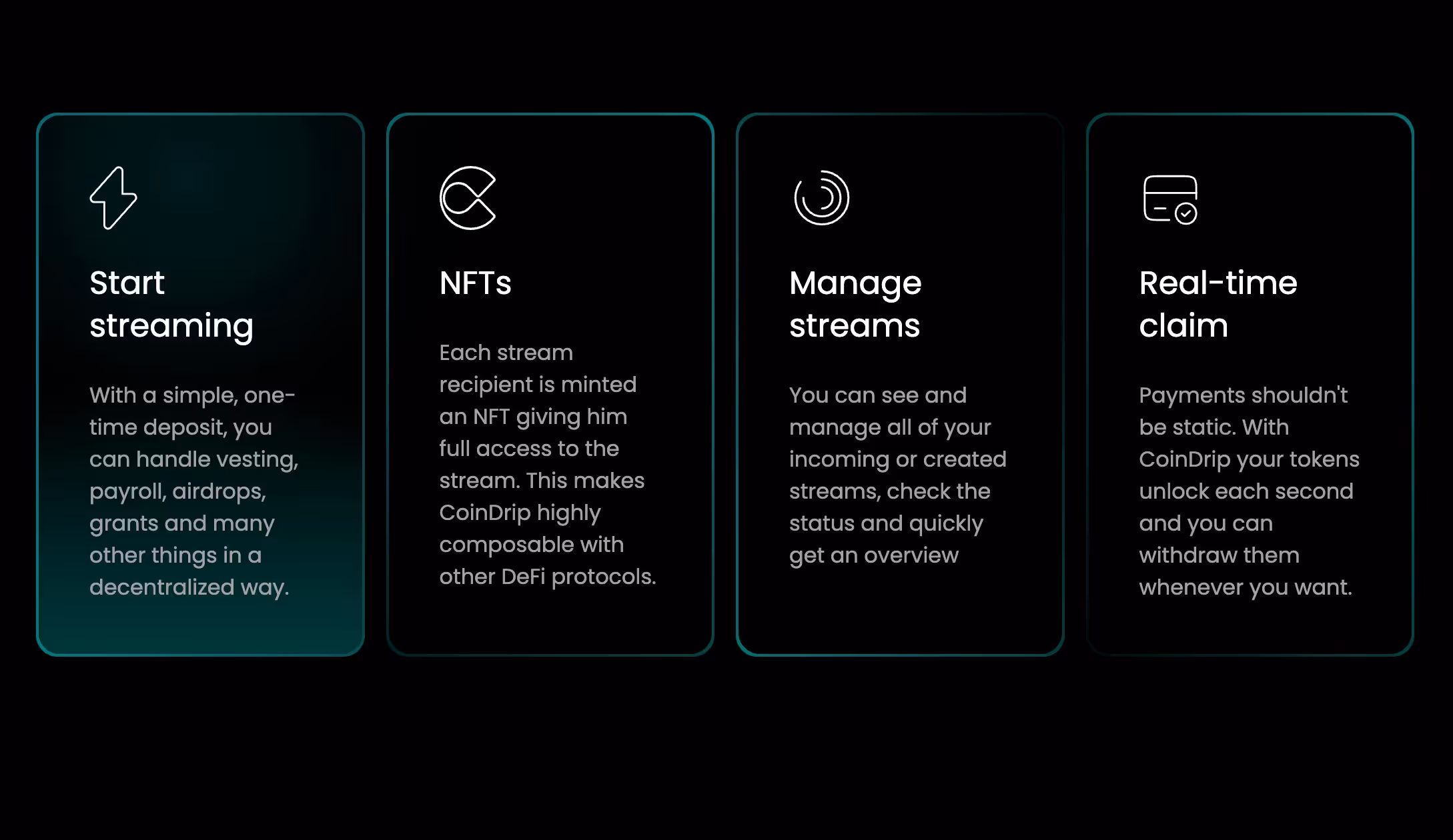 CoinDrip is the first token (ESDT) streaming protocol built on MultiversX. Instead of the regular token transfers, you can use CoinDrip to stream tokens each second toward a recipient.